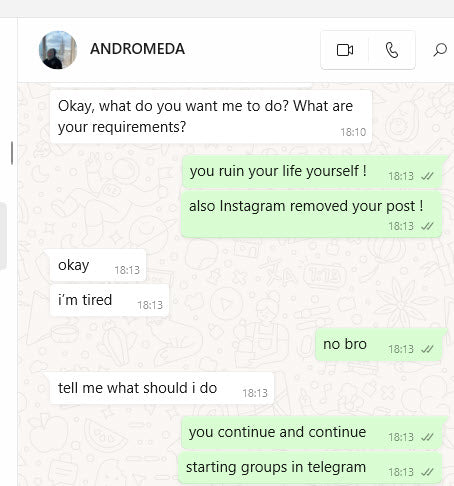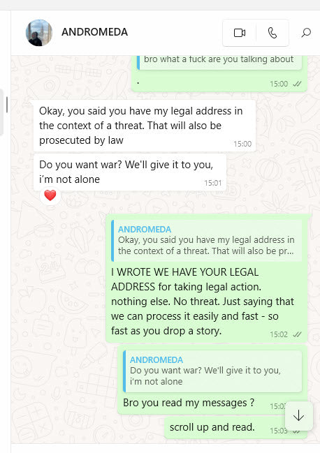 - Although offering to talk about the situation and amicable offers from Phonkhell, Andromeda wanted "war" ("Do you want war? We'll give it to you, I'm not alone"), leaked the private phone number of the CEO into groups (we blackened the sensitive parts, Andromeda leaked it full in public), and started Telegram campaigns in russian language.