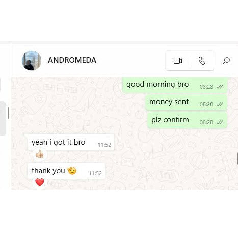 - “Yeah I got it bro 👍🏼 … Thank you 😊 ❤” (after confirming payments).