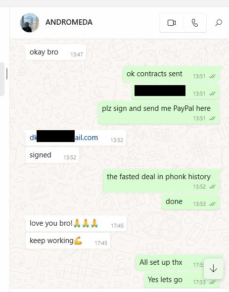 The timing of Andromeda's unfound accusations is not a mystery: in end of January 2025 he signed the contracts, shortly after he had a viral track with "Montagem Coma" released in June 2025, the story suddenly changed. From “thank you bro, love working with you ❤” to “scam label", "never signed the contract", didn't know about.”