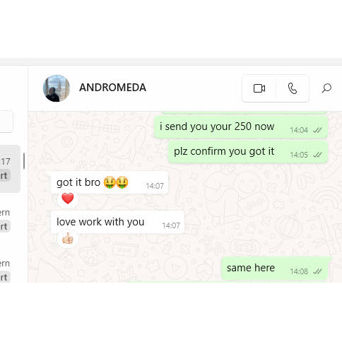 - “Got it bro ❤ love work with you 👍🏼” (after receiving more payments).