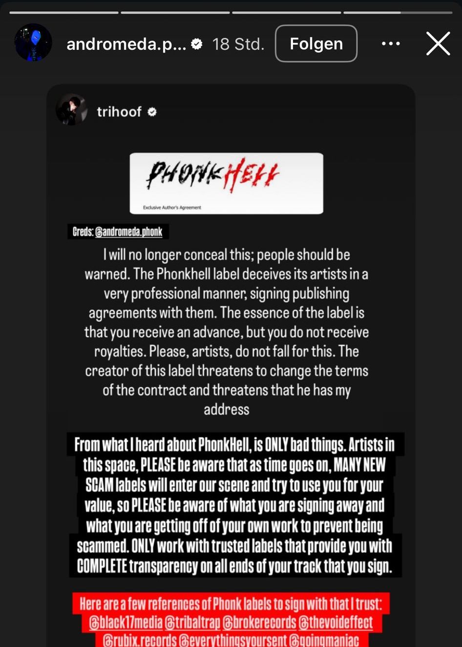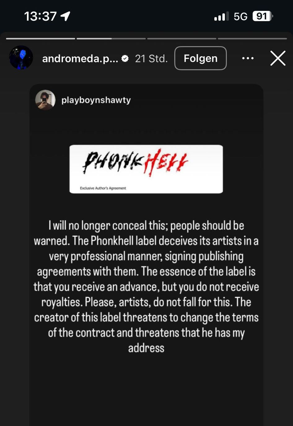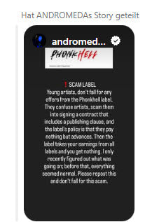 In October 2025, the situation escalates and Andromeda decided to start a slander talk in public against his label and publisher Phonkhell:
